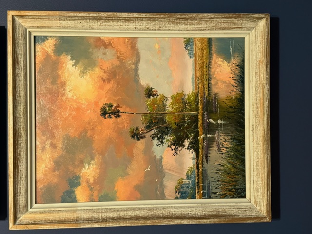 Heavy palette knife landscape scene with a rain storm approaching from the West with water reflections of sky ,birds and tall palms. Provenance : comes with a COA and appraisal value of $7200 from USPAP