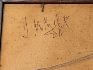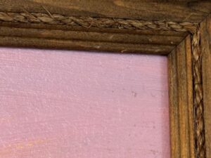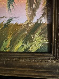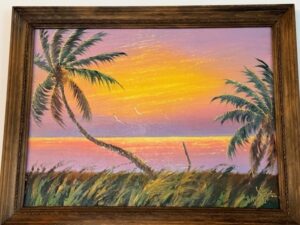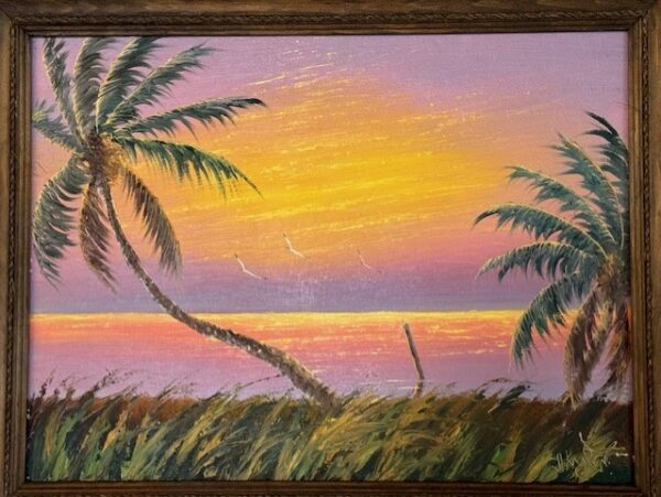 Oil on Upson- signed lower right and upper left on back . A pastel sky of purple, pink, orange, and yellow radiates over the ocean. Two palms are the main focus of the scene. board measures 24×18 . African American Highwaymen Folk Art, evolved from the Backus Indian River School Art Colony.