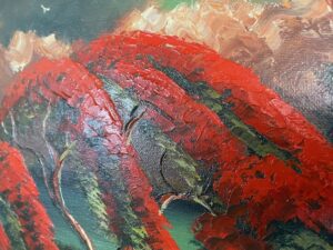 Full bloom Poinciana with a vivid rich full palette knife against twin palms and a classic palette knife purple thunder sky. Canvas measures 16×20 framed to overall size of 21×25.